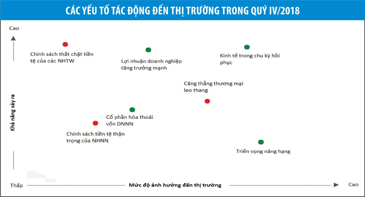 Theo KBSV, các yếu tố chính mang tính rủi ro tác động tiêu cực đến thị trường bao gồm: Rủi ro căng thẳng cuộc chiến thương mại Mỹ - Trung Quốc leo thang; động thái thắt chặt chính sách tiền tệ của các ngân hàng trung ương lớn trên thế giới và chính sách tiền tệ mang tính thận trọng của Ngân hàng Nhà nước Việt Nam.