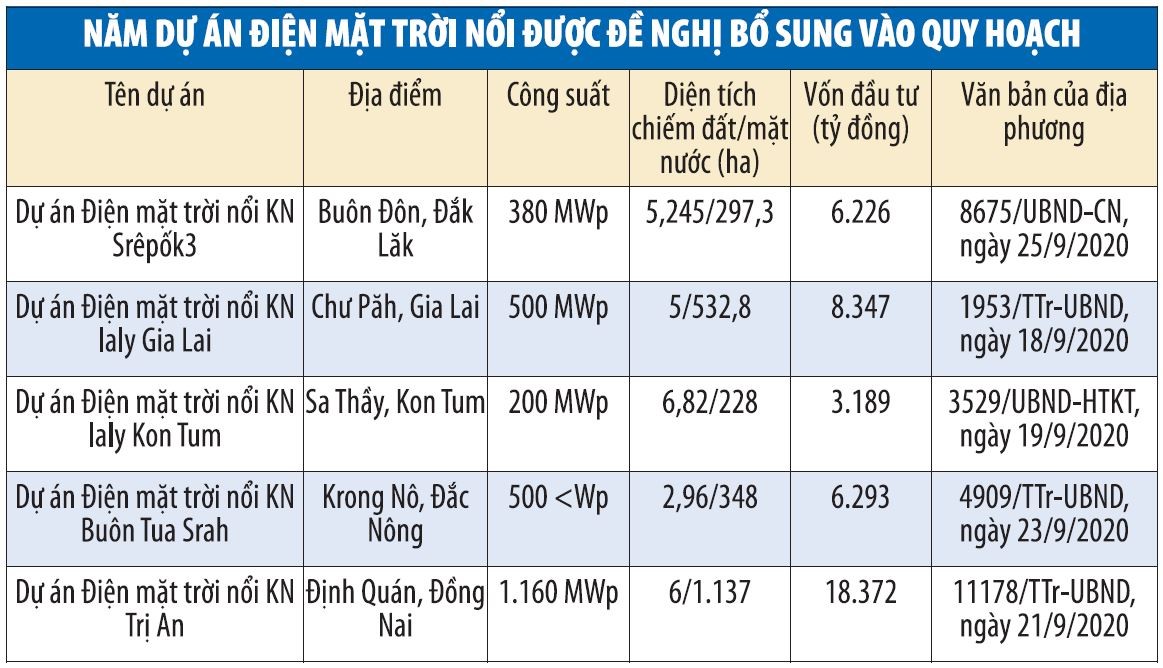 Các dự án điện mặt trời nổi trên được UBND các địa phương liên quan đề xuất tới Bộ Công thương bổ sung vào quy hoạch điện trong thời gian từ ngày 19/9/2020 đến ngày 25/9/2020.