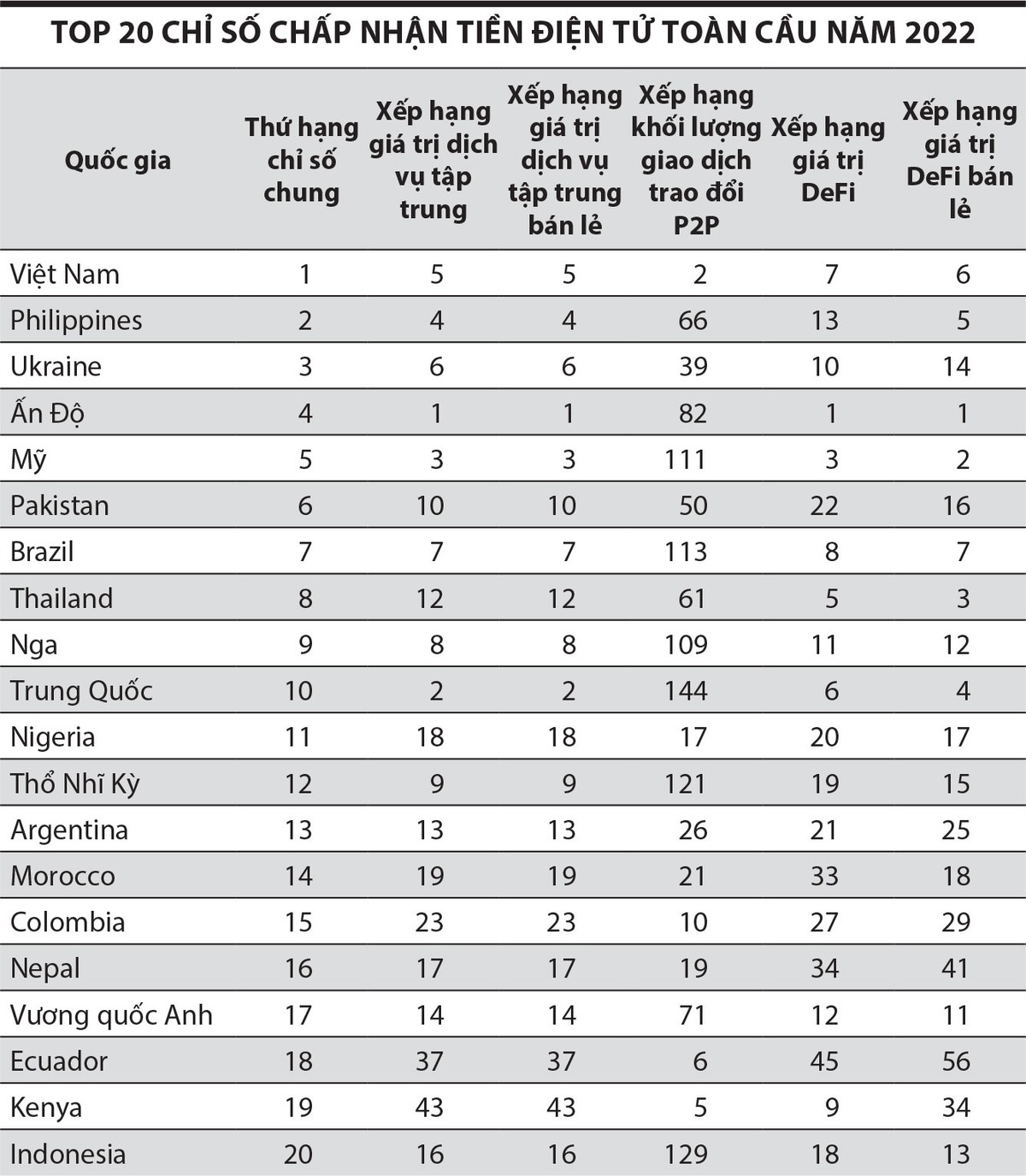 Nhìn vào các bảng xếp hạng cho thấy Việt Nam có sức mua cực cao và mức độ chấp nhận được điều chỉnh theo dân số trên các công cụ tiền điện tử tập trung, DeFi và P2P. Một cuộc khảo sát được Chainalysis thực hiện vào năm 2020 cũng cho thấy, 21% người Việt Nam tham gia cho biết đã sử dụng hoặc sở hữu tiền điện tử, chỉ đứng sau Nigeria (ở mức 32%) và tỷ lệ chấp nhận đã tăng lên kể từ đó.