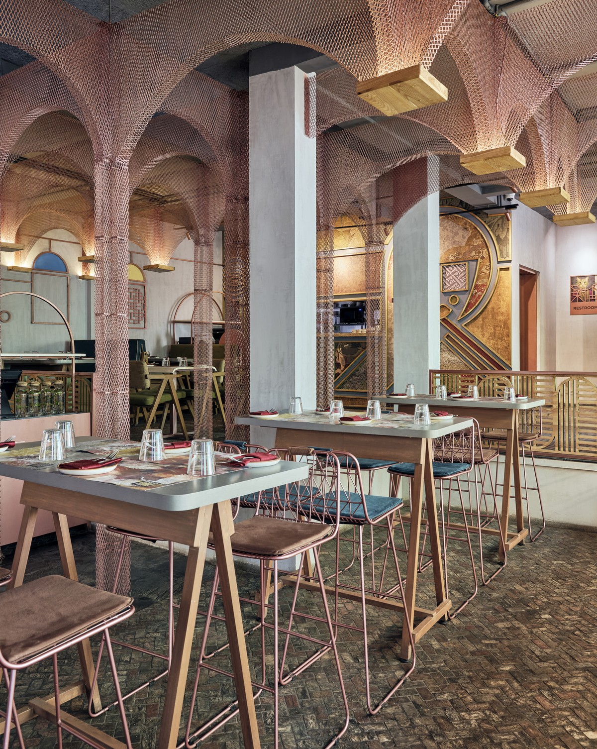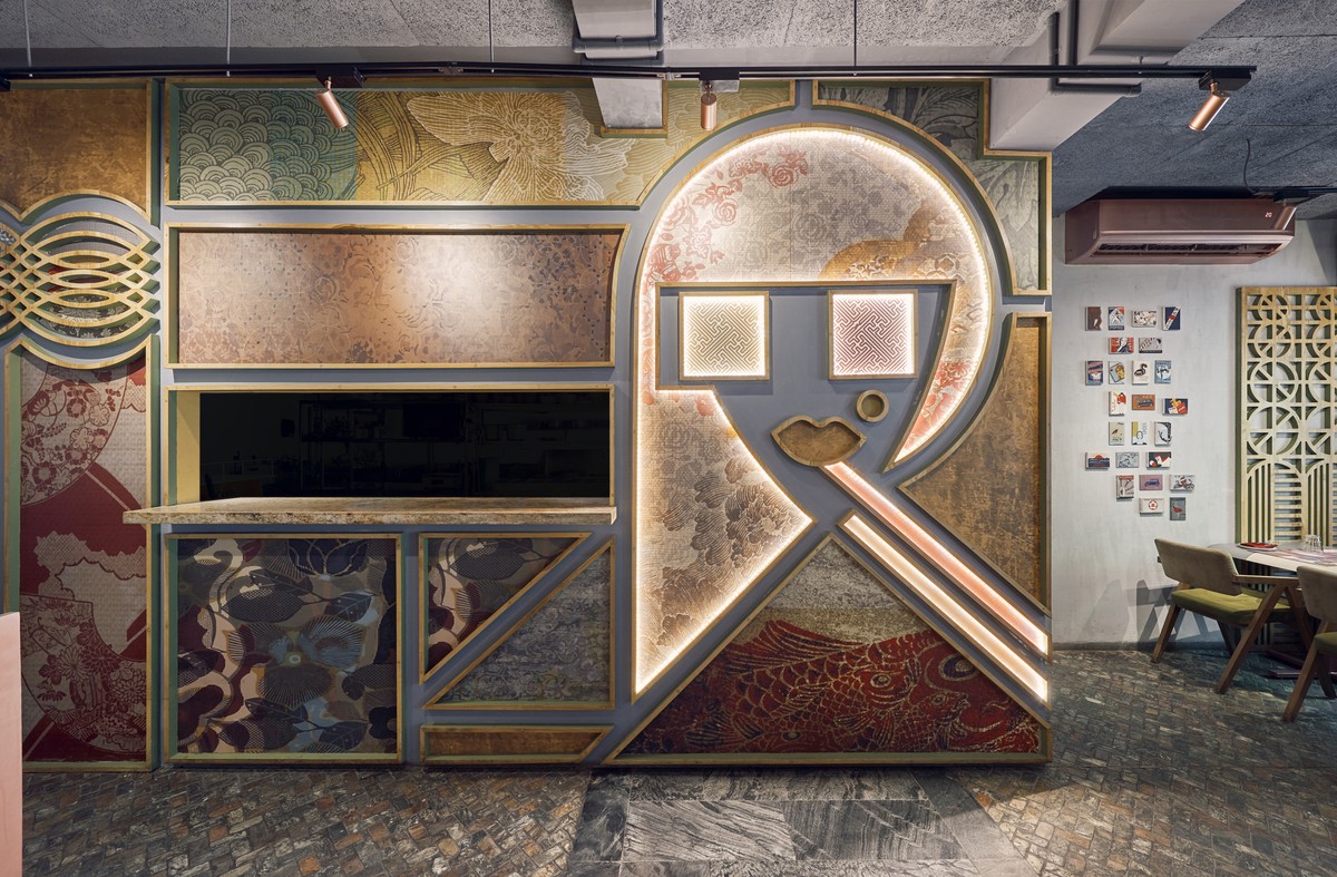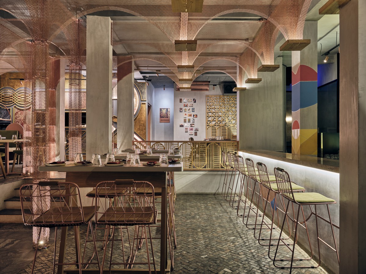 Nhà hàng Misu là cuộc chơi của màu sắc và chất liệu, nơi các sắc màu sâu đậm như xanh dương, xanh lá, vàng mù tạt và đỏ thẫm được sử dụng là điểm nhấn bên cạnh sắc đồng lấp lánh đặc trưng của vật liệu kim loại.