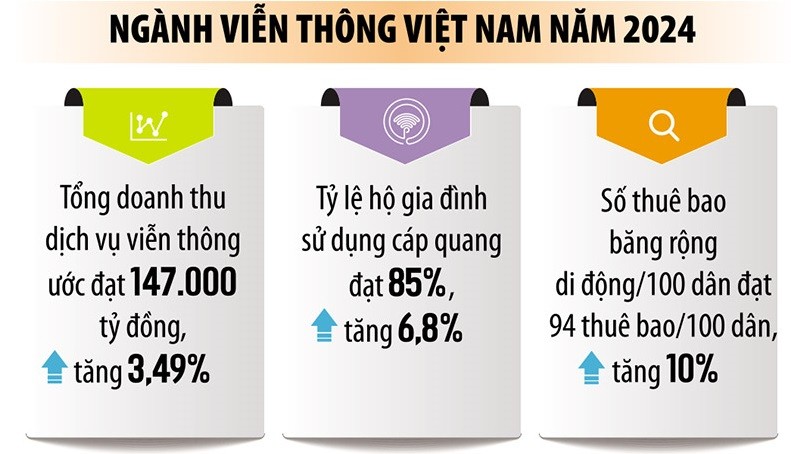 Viettel cũng có sự tăng trưởng ấn tượng trong năm 2024, với doanh thu hợp nhất 190.000 tỷ đồng, hoàn thành 103% kế hoạch, tăng trưởng 10,3% - là mức tăng cao nhất trong ngành viễn thông. Tập đoàn đã chuyển đổi thành công 6,5 triệu thuê bao 2G lên 4G trước thời điểm dừng cung cấp dịch vụ 2G Only, lắp đặt thêm hơn 6.000 trạm BTS giúp mở rộng vùng phủ 4G tới 98% dân số. Đây cũng là doanh nghiệp đầu tiên cung cấp dịch vụ 5G tại Việt Nam và kinh doanh dịch vụ 5G tại Peru và Lào.