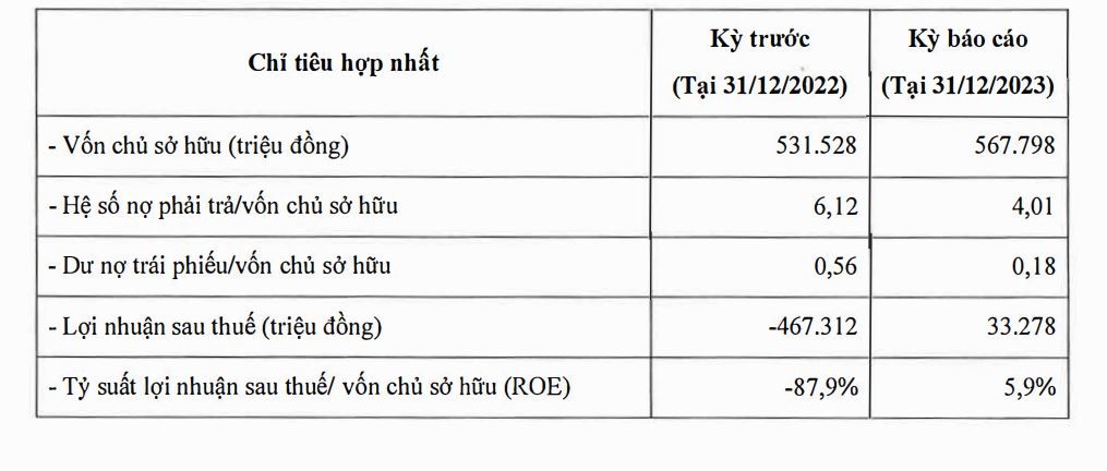 Tương ứng, chỉ số DAR (nợ phải trả/vốn chủ sở hữu) cũng giảm xuống còn 4,01 so với 6,12 năm trước đó. Dư nợ trái phiếu đã giảm đáng kể từ 295 tỷ đồng cuối năm 2022 về 100 tỷ cuối năm 2023. Trong khi đó, tổng tài sản của Công ty đạt 2.845 tỷ đồng.