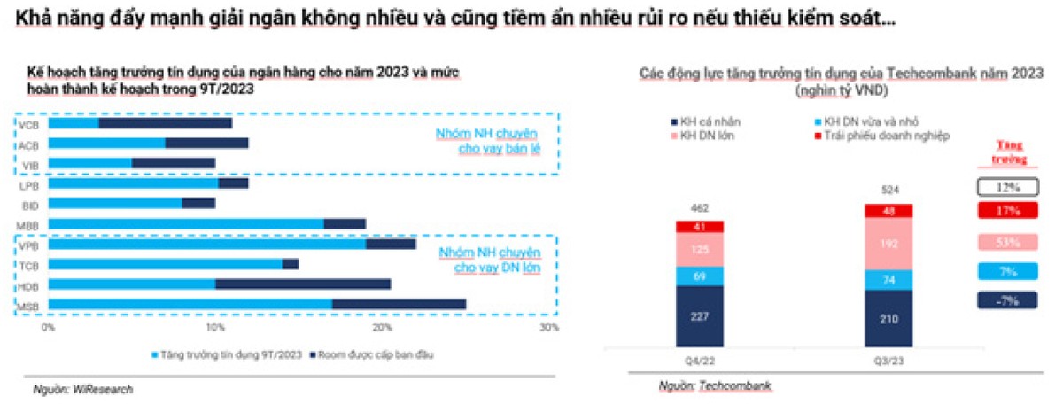 Các ngân hàng có tỷ trọng cho vay doanh nghiệp cao đã có mức tăng trưởng tín dụng cao nhất trong năm 2023 và khả năng đã được nới thêm room cuối tháng 11 vừa rồi sau tuyên bố sẽ phân bổ lại nguồn room giữa các ngân hàng với nhau. Tính đến cuối tháng 9, tăng trưởng tín dụng của các ngân hàng SHB, Techcombank và VPBank lần lượt đạt mức 10%, 13,5% và 22%, cao hơn rất nhiều so với mức toàn ngành chỉ khoảng 6,9%, gần như cạn mức room tín dụng được phân bổ của năm.