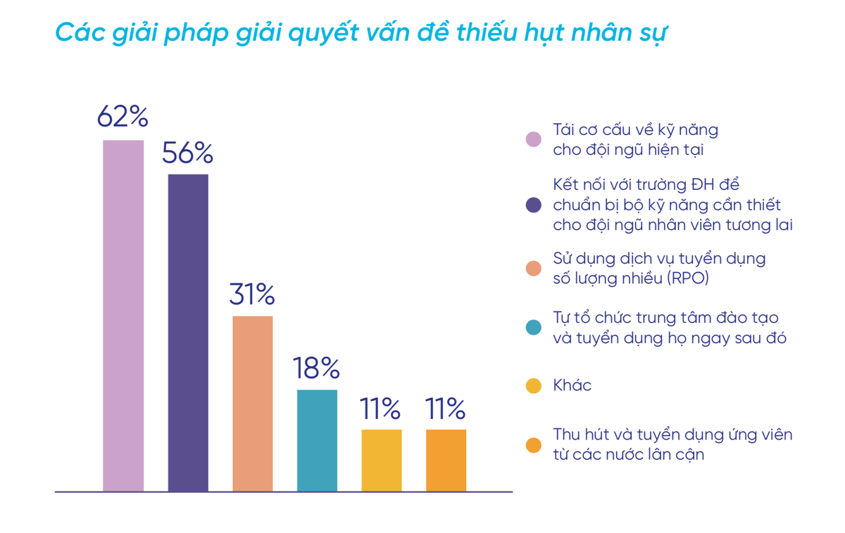 Trước tình trạng khan hiếm nhân lực ngành công nghệ, nhiều doanh nghiệp cũng thể hiện tầm nhìn xa hơn trong công tác tuyển dụng lẫn tận dụng phát triển nguồn nhân lực sẵn có. Theo đó, có đến 62% doanh nghiệp chọn sẽ tái cơ cấu về kỹ năng cho đội ngũ hiện tại và 56% chọn kết nối với trường Đại học để chuẩn bị bộ kỹ năng cần thiết cho đội ngũ nhân viên trong tương lai.