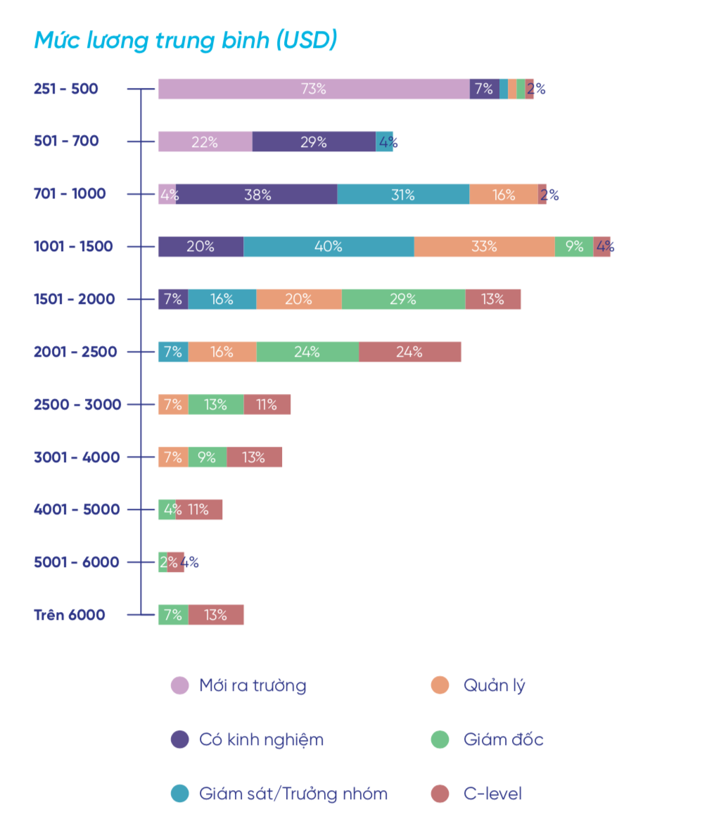Khi so sánh theo mặt bằng lương chung (theo Báo cáo lương của VietnamWorks), nhà tuyển dụng cho thấy họ đang trả lương cho nhóm ứng viên có kinh nghiệm cao hơn một bậc so với nhiều ngành nghề khác với khoảng lương từ 701 - 1000 USD. So với các ngành nghề khác, mức lương phổ biến được trả cho nhóm ứng viên có kinh nghiệm là 251 - 500 hoặc 501 - 700 USD.