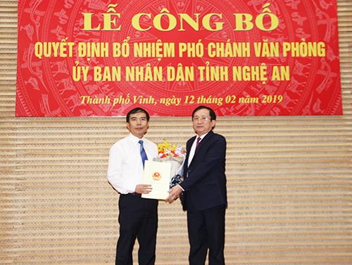 Chiều 12/2, Phó Chủ tịch UBND tỉnh Nghệ An Đinh Viết Hồng đã trao Quyết định số 367/QĐ-UBND của UBND tỉnh Nghệ An bổ nhiệm đồng chí Đào Quang Thiền, Trưởng phòng Kinh tế, Văn phòng UBND tỉnh giữ chức Phó Chánh Văn phòng UBND tỉnh.