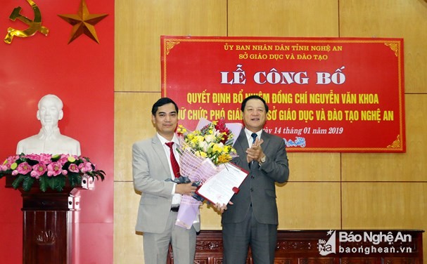 Sáng 14/11, đồng chí Lê Minh Thông, Phó Chủ tịch UBND tỉnh Nghệ An đã trao Quyết định số 25/QĐ -UBND của Chủ tịch UBND tỉnh điều động và bổ nhiệm đồng chí Nguyễn Văn Khoa, chuyên viên Văn phòng UBND tỉnh giữ chức vụ Phó Giám đốc Sở Giáo dục và Đào tạo Nghệ An, thời hạn bổ nhiệm là 5 năm.
