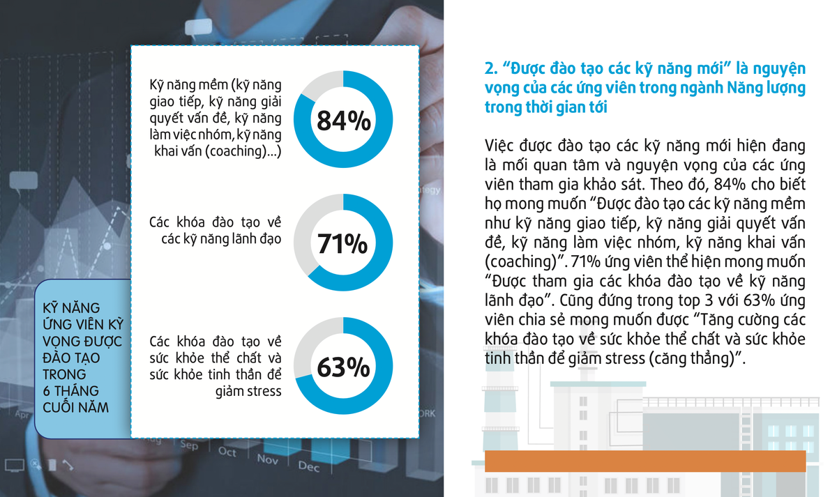 Các ứng viên trong ngành năng lượng thể hiện sự nhất quán về việc lựa chọn ưu tiên phát triển các kỹ năng liên quan đến công việc trong thời kỳ “bình thường mới” nhằm phát triển sự nghiệp trong tương lai. Khi nguyện vọng của họ chủ yếu liên quan đến việc “được đào tạo các kỹ năng mới” thì cá nhân họ cũng thể hiện các ưu tiên của mình liên quan đến việc học hỏi các kỹ năng này.