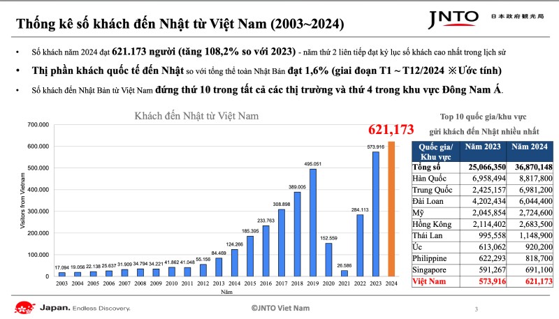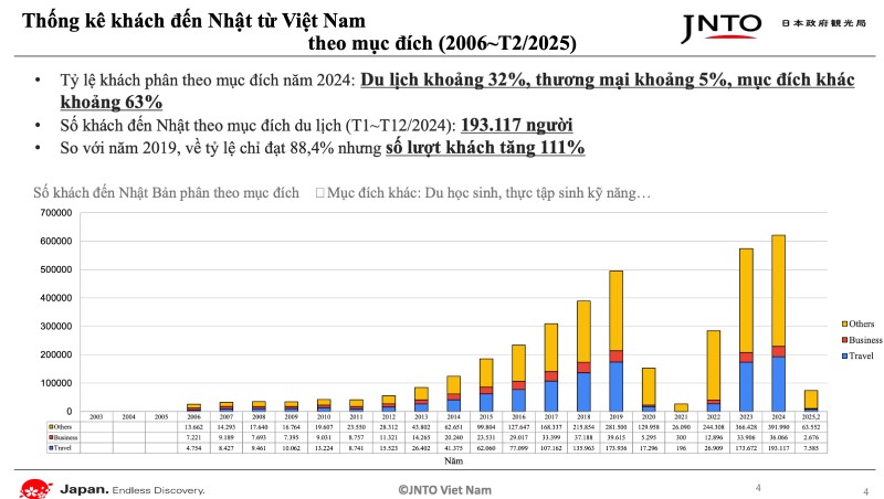 Năm 2024, số lượng khách Việt Nam đến Nhật Bản đạt 621.173 lượt, tăng 8,2% so với năm 2023 và là năm thứ hai liên tiếp lập kỷ lục mới. Riêng 5 tháng đầu năm 2025, con số này tiếp tục tăng 9,6%, đạt 311.700 lượt khách.