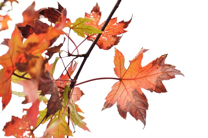 Những chiếc lá chuyển dần sắc màu từ xanh sang đỏ trên cành cây.