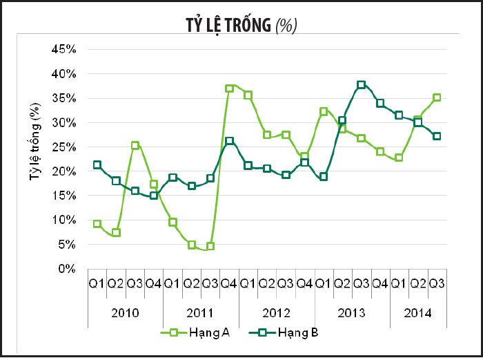 Khách thuê trong năm 2014 vẫn nghiêng nhiều về xu hướng chuyển văn phòng, mở rộng hoặc gia hạn hợp đồng thuê (75%) so với tỷ lệ thuê mới (25%), trong đó các nhóm ngành có yêu cầu nhiều nhất là kỹ thuật điện tử, dược, ngân hàng, luật và dịch vụ tài chính, tư vấn.