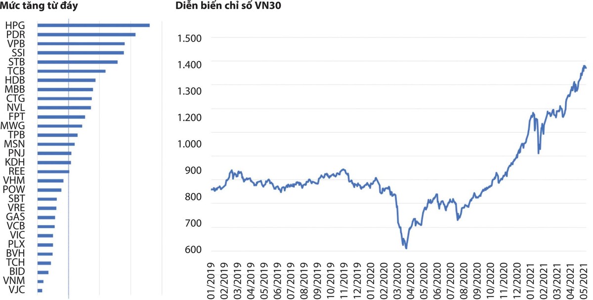 Trên thị trường chứng khoán Việt Nam, chỉ tính riêng nhóm cổ phiếu VN30, sau khi tạo đáy ở quanh 600 điểm vào tháng 3/2020, hiện chỉ số đã tăng hơn 130% (hơn gấp đôi) và áp sát ngưỡng 1.400 điểm. Có hơn một nửa số cổ phiếu trong nhóm này đã tăng giá hơn gấp đôi cùng với đà tăng của chỉ số; trong đó, các cổ phiếu chu kỳ có mức tăng mạnh nhất.