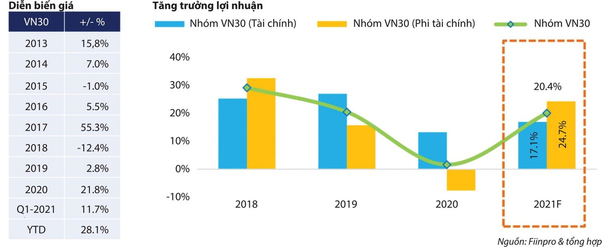 Để lấy mẫu đại diện, bài viết sẽ tiếp tục phân tích trên VN30, nhóm cổ phiếu đại diện cho hơn 70% vốn hóa của HOSE. Trong báo cáo hồi tháng 4 của mình, Fiinpro đưa ra dự báo mức tăng trưởng lợi nhuận 2021 của nhóm này ở mức 20,4%, với sự phục hồi mạnh mẽ hơn của nhóm phi tài chính.