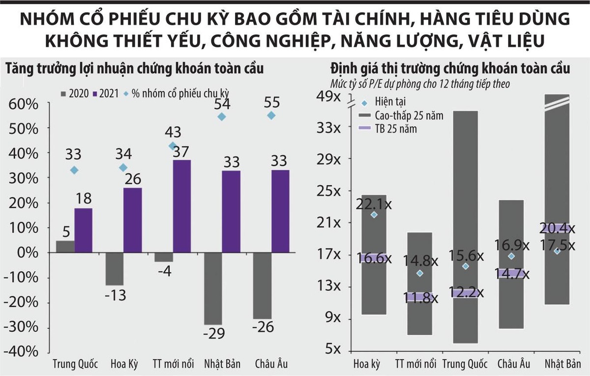 Thậm chí, ở nhiều thị trường có mức sụt giảm lợi nhuận lớn trong năm 2020 như châu Âu và Nhật Bản, mức tăng trưởng lợi nhuận dự báo cho nhóm cổ phiếu chu kỳ ở mức trên 50%.