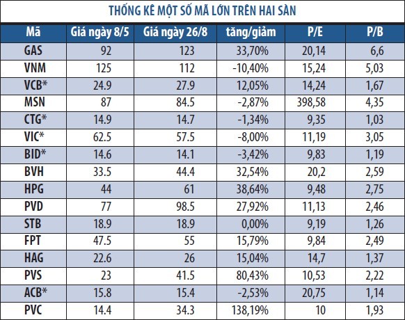 Trong giai đoạn này, 13 mã có vốn hóa lớn nhất HOSE đều tăng giá, ngoại trừ MSN. Trong đó, HPG tăng tới 38,64%, GAS tăng 33,7%, BVH tăng 32,54%, VIC tăng 27,71%. P/E của các mã này cũng đang tăng lên, trong đó có 8 mã có P/E trên 10, với 4 mã có P/E trên 15.