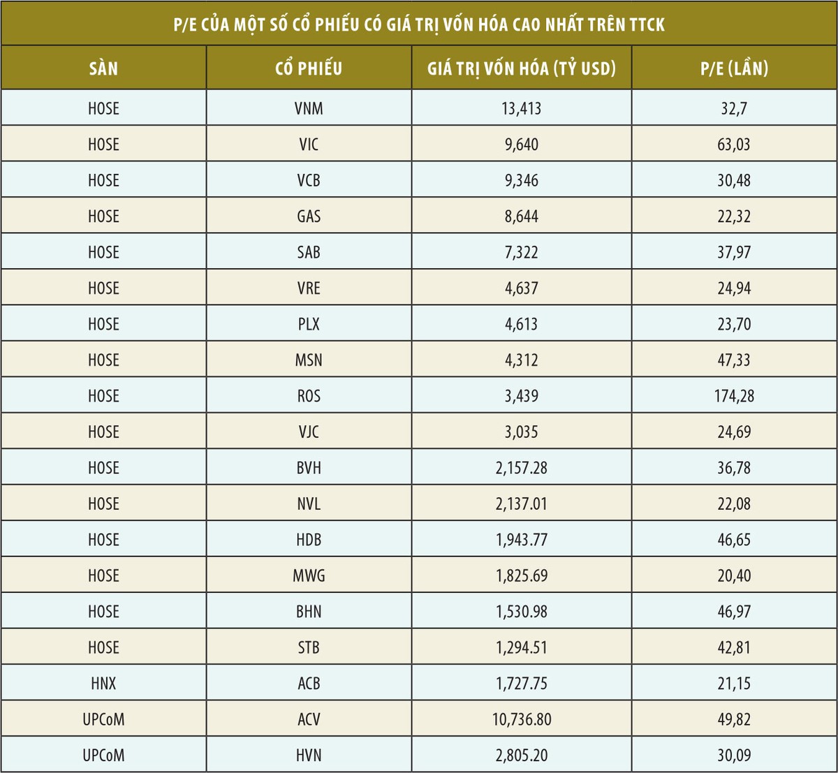 Nhiều cổ phiếu có P/E từ 30 đến 60 lần, thậm chí mã ROS có P/E tới 174 lần, vốn hóa thị trường của cổ phiếu lên tới 3.438 triệu USD. Thống kê sơ bộ cho thấy, trên sàn HOSE có tới 17 mã cổ phiếu có PE trên 50 lần, sàn HNX có 19 cổ phiếu và sàn UPCoM cũng “đóng góp” hai mã có P/E trên 50 lần. Trong đó, có cổ phiếu có P/E lên tới hàng trăm lần, nhưng hoạt động kinh doanh của doanh nghiệp lại không mấy khả quan.