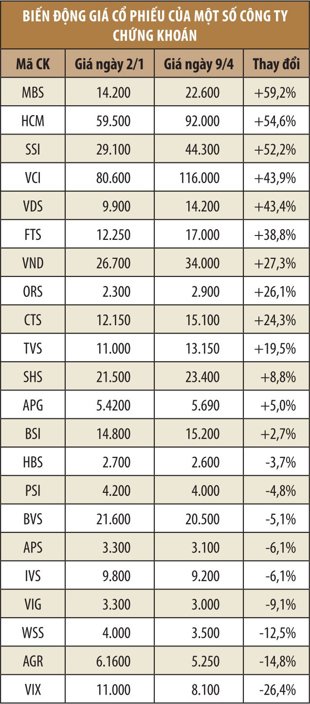 Đối với các công ty chứng khoán, niêm vui dường như đang được nhân đôi khi giá cổ phiếu của khối này cũng ghi nhận tăng trưởng tích cực. Tính từ đầu năm 2018 đến ngày 9/4, nhóm cổ phiếu chứng khoán về cơ bản đều ghi nhận tăng giá, tăng mạnh nhất là cổ phiếu VND của Công ty Chứng khoán VNDIRECT với mức tăng hơn 60%, cổ phiếu HCM của HSC tăng gần 50%, cổ phiếu VCI của VCSC tăng 39,8%...
