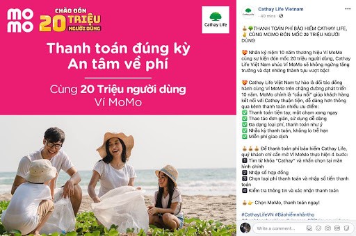 “Cathay Life Việt Nam tự hào là đối tác đồng hành cùng Ví MoMo trên chặng đường phát triển 10 năm, MoMo chính là “cầu nối” giúp khách hàng kết nối với Cathay thuận tiện, dễ dàng hơn thông qua kênh thanh toán nhiều ưu điểm như: Thanh toán tiện tay, một chạm xong ngay, thao tác đơn giản, sử dụng dễ dàng, đa dạng loại phí, thanh toán như ý, nhắc kỳ thanh toán, không lo trễ hạn, miễn phí giao dịch”, Cathay Life Việt Nam chia sẻ trên fanpage.