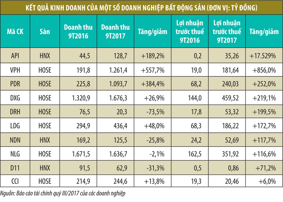 Lợi nhuận đột biến trong quý III/2017 là yếu tố giúp nhiều cổ phiếu tăng giá mạnh. Một số ý kiến nhận định, quý III là “điểm rơi” lợi nhuận của một số doanh nghiệp bất động sản, nhưng một số doanh nghiệp khác có thể có điểm rơi vào quý IV, hoặc có khả năng tiếp tục đạt lợi nhuận cao. Do đó, nhóm cổ phiếu bất động sản nhìn chung vẫn có khả năng tăng giá từ nay đến cuối năm.