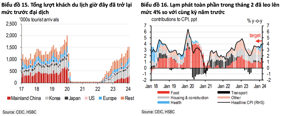 Trong khi đó, nhìn vào thị trường trong nước, tăng trưởng bán lẻ của hai tháng 1 và 2 đã hạ xuống 2,7% so với cùng kỳ năm trước do tăng trưởng tiêu dùng hàng hóa dịu lại. Mặc dù vậy, tình hình chi tiêu mạnh tay cho dịch vụ vẫn tiếp tục, trong đó du lịch nội địa mạnh mẽ với 10,5 triệu lượt khách trong giai đoạn nghỉ Tết. Du khách quốc tế cũng tiếp tục nối gót đà này, trong đó du khách Trung Quốc đại lục trở lại khoảng 60% mức của năm 2019, đưa tổng du khách lên ngang bằng với mức trước đại dịch.