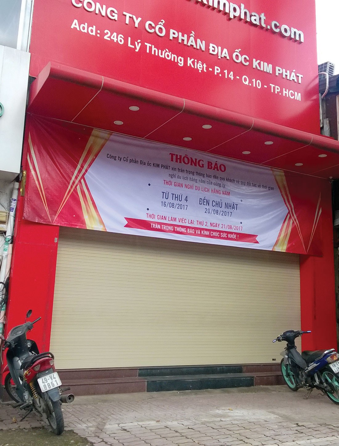 Trụ sở Công ty Kim Phát tuần qua đóng cửa với thông báo Công ty đang đi du lịch. Ảnh: Tiêu Lãng