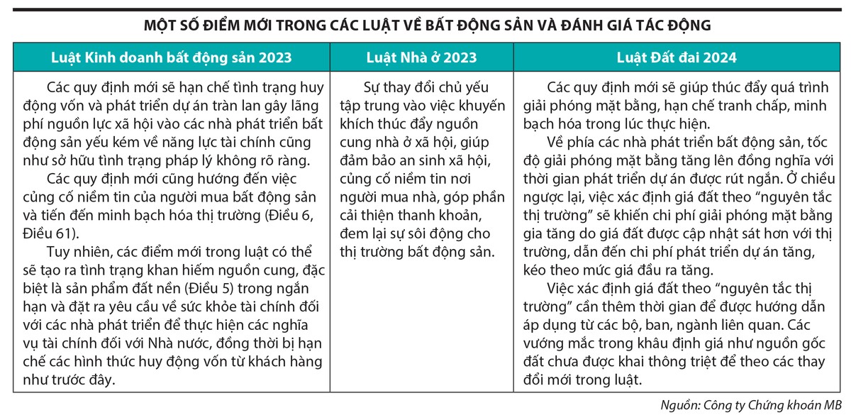 Công ty Chứng khoán KB Việt Nam nhìn nhận, Luật Kinh doanh bất động sản 2023, Luật Nhà ở 2023, Luật Đất đai 2024 có nhiều quy định mới, khi có hiệu lực sẽ góp phần cải thiện tâm lý của người mua nhà và rút ngắn thời gian hoàn thiện pháp lý của chủ đầu tư, cải thiện nguồn cung. Đây là cơ hội cho các chủ đầu tư có sức khỏe tài chính và khả năng triển khai dự án tốt. Tuy nhiên, cần có thời gian để các chính sách thực sự phát huy tác động và một số vướng mắc về pháp lý cần hướng dẫn giải quyết cụ thể hơn.