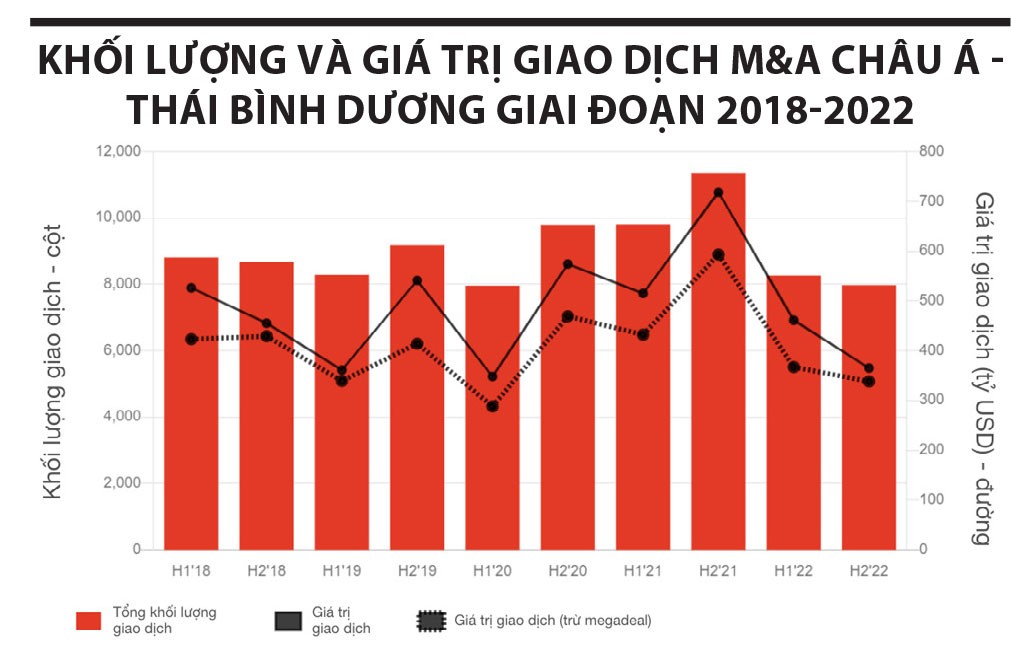 Tại châu Á - Thái Bình Dương (khoảng 16.000 giao dịch), khối lượng và giá trị giao dịch giảm lần lượt 23% và 33% trong giai đoạn 2021-2022. Trung Quốc ghi nhận sự sụt giảm lớn nhất, với khối lượng và giá trị giao dịch lần lượt giảm 46% và 35% do ảnh hưởng Covid-19 và nhu cầu xuất khẩu suy giảm. Các công ty muốn tiếp cận thị trường châu Á đang tìm kiếm cơ hội đầu tư ngoài Trung Quốc, chẳng hạn Ấn Độ, Nhật Bản và các quốc gia khác trong khu vực Đông Nam Á. Trong đó, Ấn Độ đã nổi lên như một điểm đến đầu tư hấp dẫn, vượt qua Nhật Bản và Hàn Quốc về giá trị thương vụ và xếp thứ hai trong khu vực, chỉ sau Trung Quốc.
