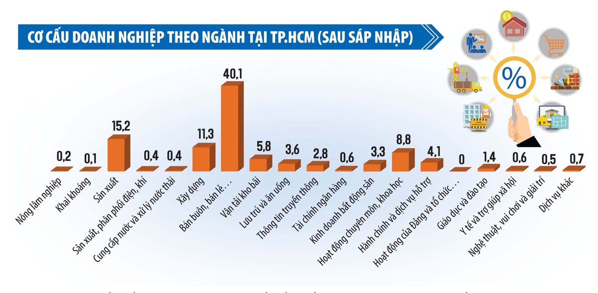 Vấn đề là, khi xét riêng đối với từng địa phương trước hợp nhất (Bà Rịa - Vũng Tàu, Bình Dương, TP.HCM), điều khá thú vị là gần 40% số doanh nghiệp ở cả 3 địa phương hoạt động trong lĩnh vực bán buôn, bán lẻ; một tỷ lệ khá cao hoạt động trong xây dựng (9-12%). Tuy nhiên, số doanh nghiệp hoạt động trong công nghiệp chế biến, chế tạo ở Bình Dương chiếm 28%, cao hơn khá nhiều so với TP.HCM (hơn 13%) và Bà Rịa - Vũng Tàu (hơn 15%). Tỷ lệ doanh nghiệp hoạt động trong các ngành dịch vụ, như tài chính - ngân hàng, chuyên môn khoa học - công nghệ, nghiên cứu - phát triển, y tế, giáo dục... ở TP.HCM cao hơn khá nhiều so với ở 2 địa phương...