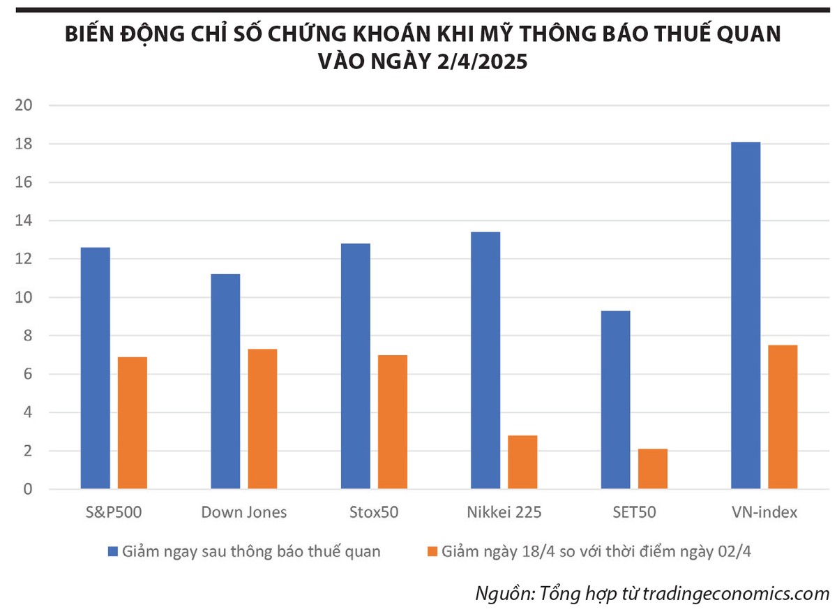 Thị trường chứng khoán Việt Nam không đứng ngoài vòng xoáy sụt giảm khi Mỹ công bố sẽ áp thuế, thậm chí mức độ ảnh hưởng mạnh hơn so với nhiều thị trường khác. Với độ mở thương mại cao, các doanh nghiệp đặc biệt là những đơn vị niêm yết trong ngành dệt may, thủy sản, điện tử, thép chịu ảnh hưởng trực tiếp hoặc gián tiếp. Chỉ trong 4 phiên đầu tiên sau thông báo về thuế của Mỹ được công bố, chỉ số VN-Index giảm tới 18,1%.