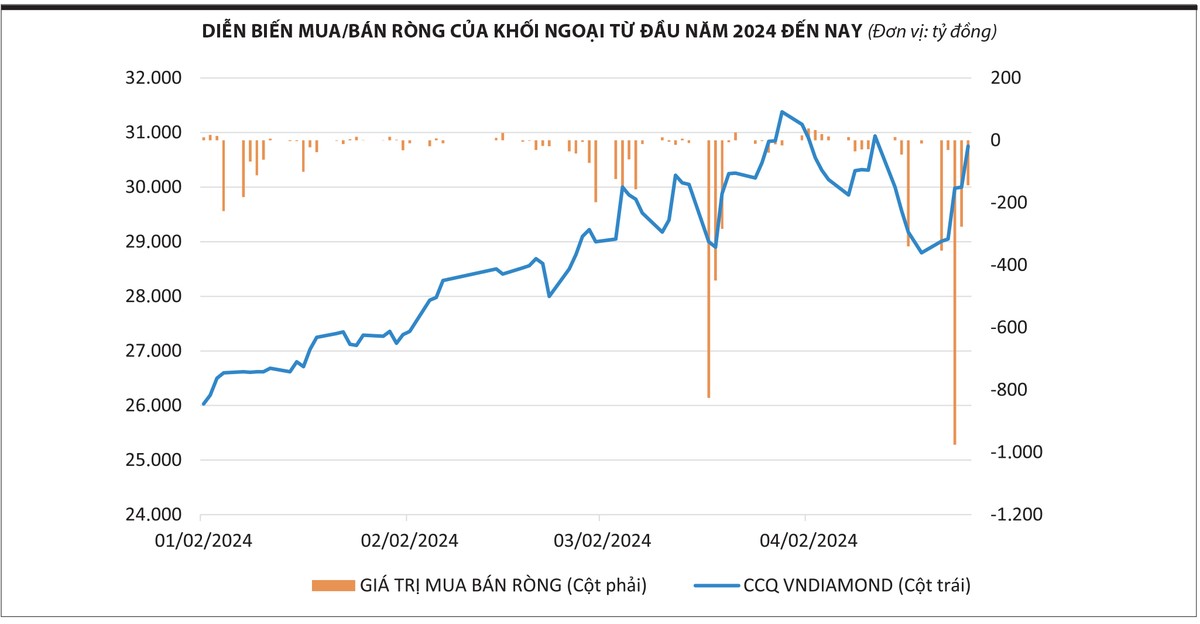 Một diễn biến đáng chú ý trong tuần qua là động thái bán ròng kỷ lục của nhà đầu tư nước ngoài trên chứng chỉ quỹ ETF VNDiamond, với quy mô gần 1.000 tỷ đồng trong ngày 24/4/2024 và tính chung cả tuần, khối ngoại “xả” gần 1.800 tỷ đồng. Trước đó, trong tháng 3/2024, khối ngoại xả rất mạnh chứng chỉ quỹ ETF và thị trường sau đó có nhịp giảm vào giữa tháng 4. Điều thú vị là trong cả 2 đợt bán này, khối ngoại đều thoái được vốn với mức giá tương đương nhau.