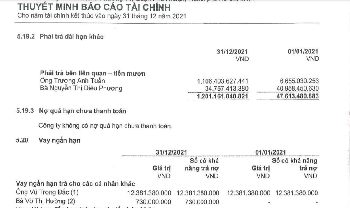 Hai là, Công ty phát sinh khoản công nợ rất lớn liên quan đến các cá nhân hơn 1.300 tỷ gồm: Nguyễn Thị Như Hiền 335 tỷ đồng, Nguyễn Trần Thùy Trang 335 tỷ đồng, Nguyễn Thị Điểm 300 tỷ đồng và Hoàng Minh Đức 337 tỷ đồng. Rõ ràng, các cá nhân này không phát sinh bất kỳ công nợ nào trước đó với Công ty, nhưng lại cho Công ty vay với số tiền rất lớn trong quý IV/2021?