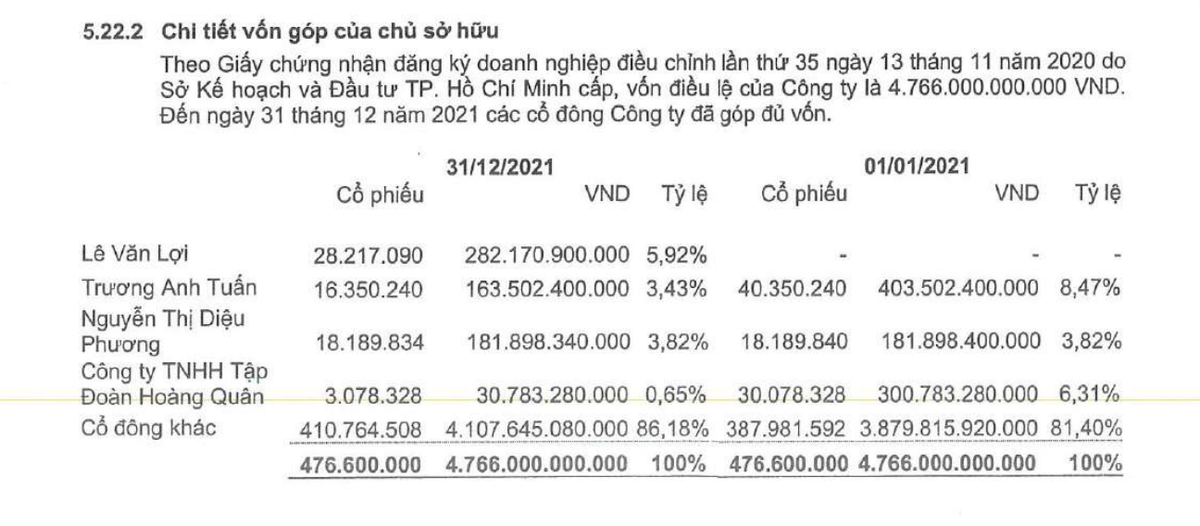 Theo báo cáo tài chính kiểm toán năm 2021, tỷ lệ sở hữu của vợ chồng ông Tuấn và cá nhân, công ty liên quan sở hữu gần 18,6% vốn cổ phần của HQC, còn lại 81,4% là do cổ đông bên khác sở hữu.