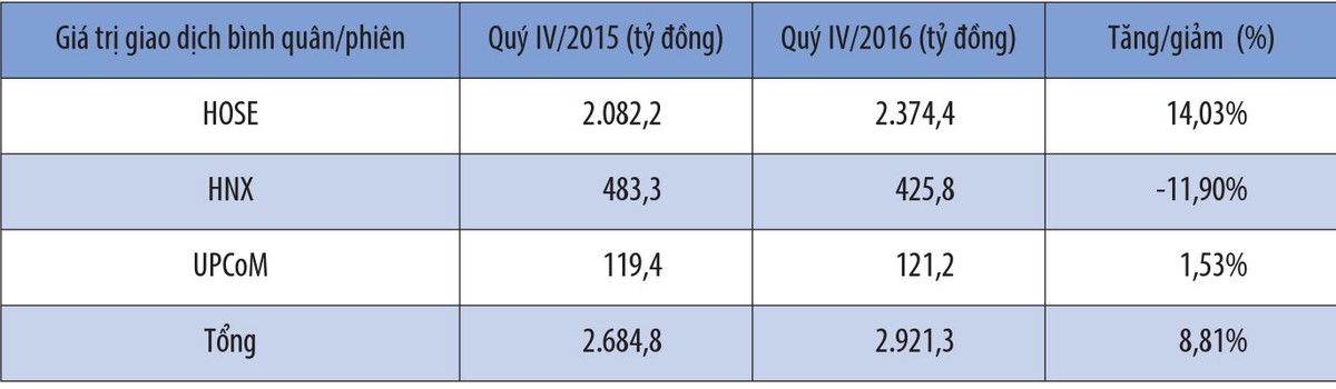 Tuy nhiên, thị trường có xu hướng xấu đi về cuối năm, chỉ số VN-Index đã giảm 4,3% so với mức tăng 18,9% đến hết quý III. Thanh khoản bình quân của quý IV chỉ đạt 2,921 tỷ đồng/phiên, giảm 5,2% so với mức bình quân trong 9 tháng đầu năm, nhưng vẫn cao hơn 8,81% so với quý IV/2015. Thanh khoản tốt giúp doanh thu mảng môi giới của các CTCK sẽ tiếp tục tăng trưởng so với cùng kỳ năm trước, đặc biệt tại nhóm các CTCK top đầu thị phần giao dịch.