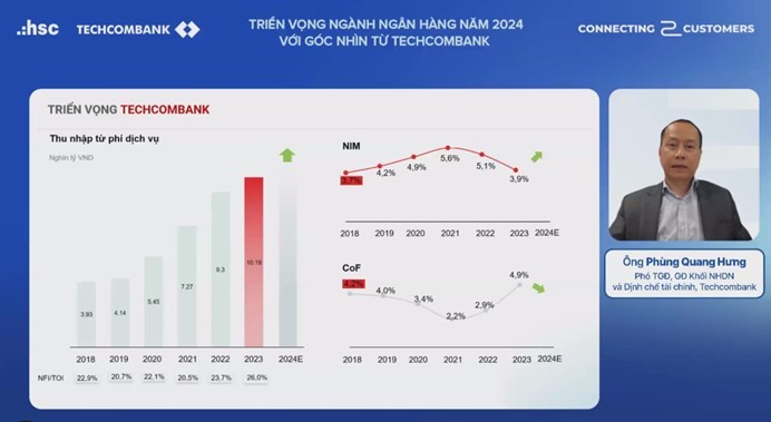 Về nguồn vốn, tỷ lệ CASA sẽ tiếp tục hồi phục, từ đó tác động đến chi phí huy động vốn và NIM có thể hồi phục trong khoảng 4% – 4,5%, sau khi đi xuống tại mức nền thấp trong năm 2023. Đặc biệt, thu nhập từ lãi tiếp tục tăng trưởng khi mở rộng khách hàng, quan trọng là thu nhập từ phí - trọng tâm chính của Techcombank sẽ tiếp tục tăng trưởng.