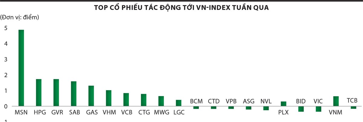 Ở chiều ngược, các cổ phiếu đóng góp tiêu cực cho thị trường là TCB với 1,17 điểm, VNM là 0,64 điểm, VIC là 0,35 điểm, BID là 0,34 điểm… Nhìn chung, các cổ phiếu trụ không quá nổi bật trong tuần qua, ngoại trừ MSN.