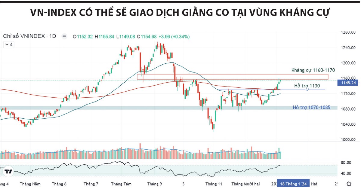 Về phương diện kỹ thuật, 1.160 - 1.170 điểm là vùng kháng cự mạnh trên đà tăng của VN-Index, đây là vùng mà chỉ số chưa vượt qua được từ tháng 9/2023 và có thể xem như đường viền cổ trong mẫu hình 2 đáy. Do đó, nhiều khả năng thị trường sẽ chịu áp lực bán tại vùng kháng cự, dù xu hướng tăng vẫn còn mạnh. Dự đoán, chỉ số sẽ có diễn biến giằng co trong tuần này.