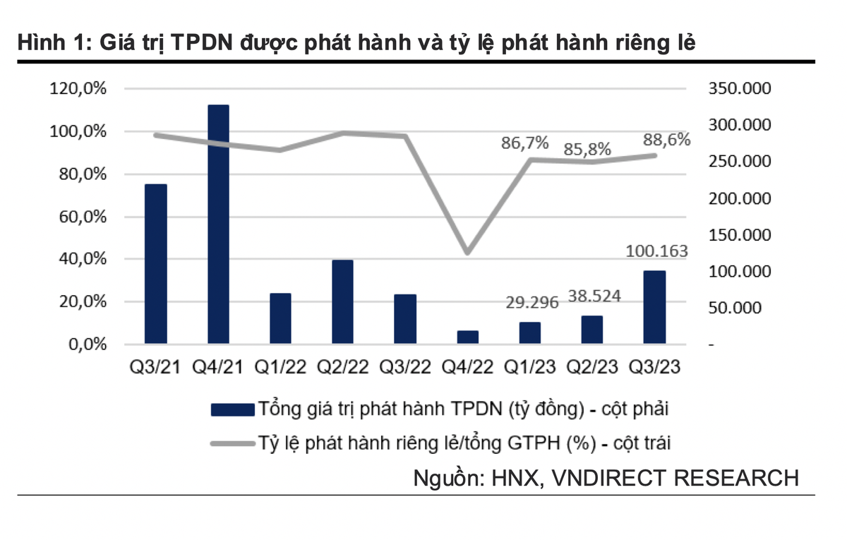 Theo số liệu tổng hợp của VNDIRECT, trong quý III/2023 có 88 đợt phát hành TPDN trong nước thành công với tổng giá trị phát hành đạt khoảng 100.163 tỷ đồng, gấp gần 2,6 lần so với quý II/2023 và tăng 50% so với cùng kỳ.