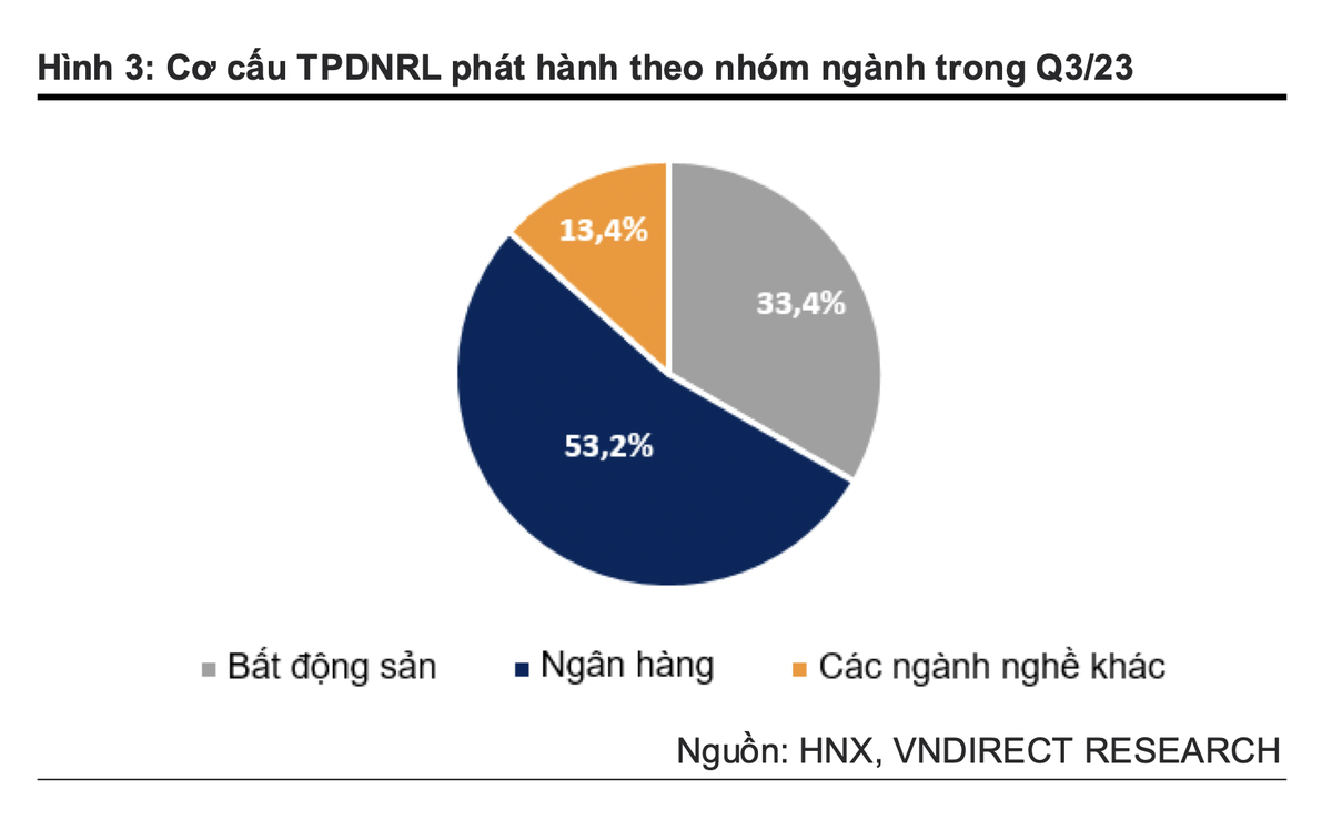 Báo cáo cho biết, hoạt động phát hành TPDN riêng lẻ có sự phục hồi tích cực trong quý III/2023, khi cao gấp gần 2,7 lần so với quý II/2023 và tăng 36,2% so với cùng kỳ. Theo VNDIRECT, sự phục hồi của hoạt động phát hành TPDN riêng lẻ này đến từ sự gia tăng phát hành của nhóm ngân hàng. Tổng giá trị TPDN riêng lẻ của nhóm ngân hàng phát hành trong quý III/2023 đạt khoảng 47.224 tỷ đồng, chiếm 53,2% tổng giá trị phát hành trong kỳ.