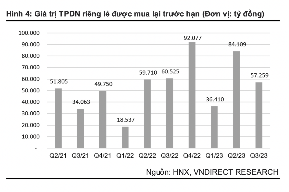 VNDIRECT cho rằng, nhu cầu tín dụng yếu cùng với việc lãi suất đã giảm mạnh và thanh khoản hệ thống ngân hàng dồi dào là điều kiện để các ngân hàng duy trì tích cực hoạt động mua lại trước hạn các lô trái phiếu phát hành riêng lẻ của mình trong quý III/2023.