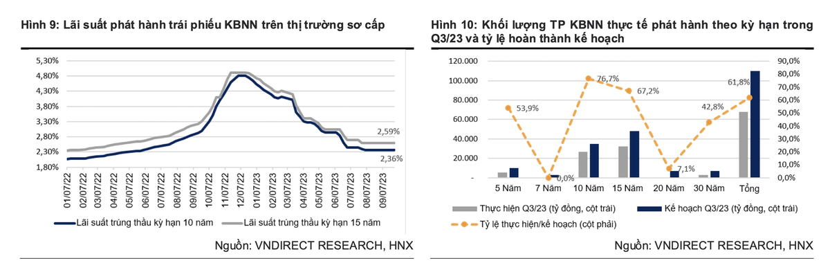 Lợi suất trúng thầu duy trì xu hướng giảm ở hầu hết các kỳ hạn kể từ đầu năm 2023. Hiện lợi suất trái phiếu trúng thầu kỳ hạn 10 năm đã giảm về mức 2,36%; giảm 24 điểm cơ bản so với cuối quý II/2023 và giảm 229 điểm cơ bản so với cuối năm 2022. Lợi suất trái phiếu trúng thầu kỳ hạn 15 năm đã giảm về mức 2,59%; giảm 26 điểm cơ bản so với cuối quý II/2023 và giảm 221 điểm cơ bản so với cuối năm 2022.