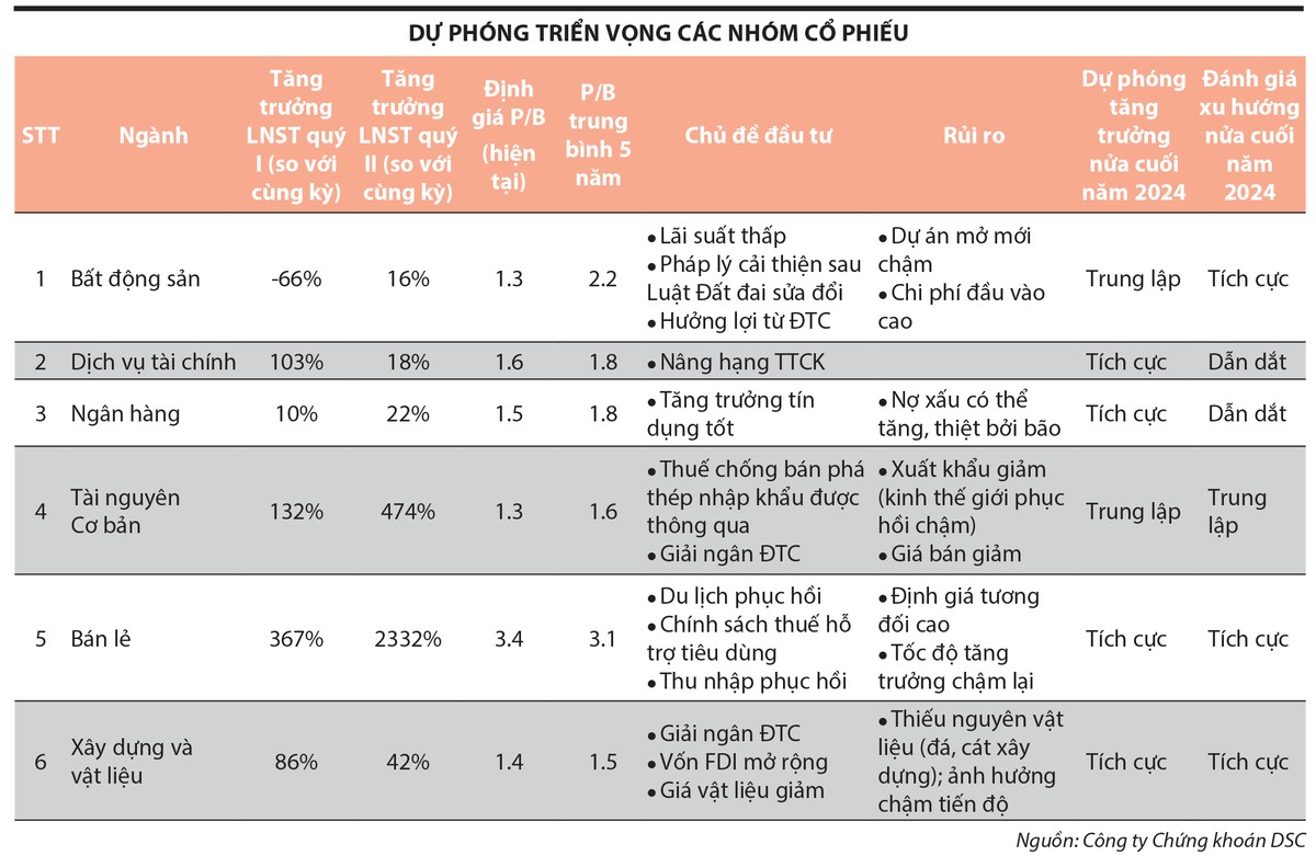 Các doanh nghiệp hoạt động trong ngành ngân hàng, hàng tiêu dùng và bất động sản đều hưởng lợi trong môi trường lãi suất thấp. Trong khi đó, các doanh nghiệp niêm yết thuộc các ngành trên đều là các doanh nghiệp có vốn hóa lớn. Do đó, nhóm cổ phiếu ngân hàng, hàng tiêu dùng, bất động sản được dự báo sẽ là động lực chính giúp thị trường chứng khoán tăng điểm tốt trong thời gian sắp tới. Hưởng lợi một cách gián tiếp là các cổ phiếu vật liệu xây dựng, trong đó có thép (điển hình là HPG). Giá thép cũng đang có dấu hiệu phục hồi sau khi Trung Quốc công bố các biện pháp kích thích nền kinh tế. Một ngành khác cũng có thể tăng tốt trong quý cuối năm là chứng khoán, với việc thị trường đang tiến rất gần được nâng hạng giúp nguồn vốn ngoại vào thị trường tăng lên.