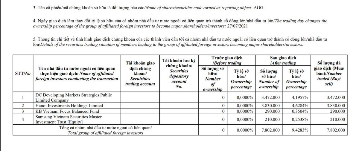 Như vậy, sau giao dịch, nhóm quỹ Dragon Capital là cổ đông nước ngoài sở hữu lớn nhất tại AGG.