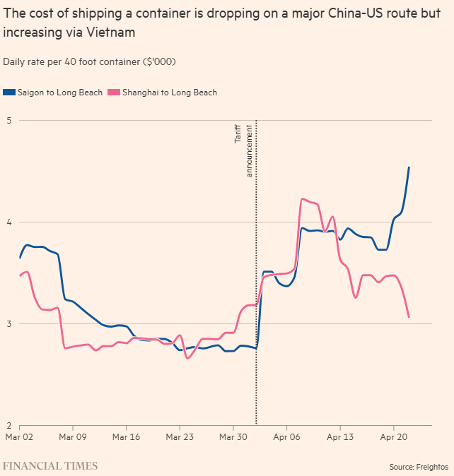 Hơn nữa, lượng đặt hàng container đến Mỹ đã giảm mạnh kể từ khi áp dụng mức thuế 145% đối với hàng nhập khẩu từ Trung Quốc vào Mỹ.