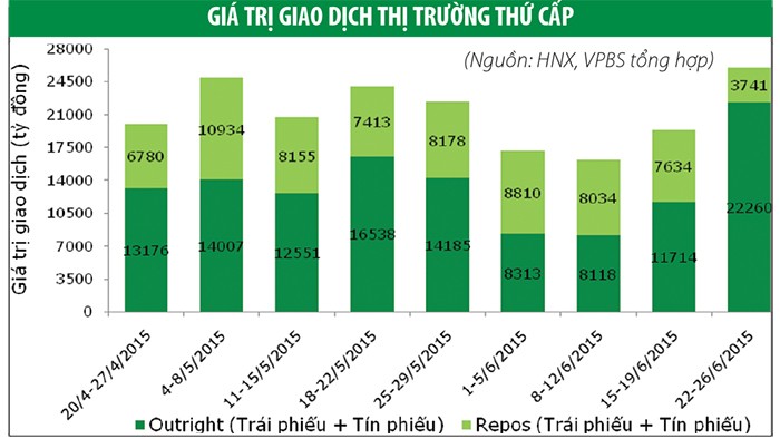Trong tuần từ 22 - 26/6, thị trường trái phiếu sơ cấp huy động được 2.840 tỷ đồng trên tổng số 5.500 tỷ đồng trái phiếu gọi thầu. Tỷ lệ trúng thầu đã được cải thiện đáng kể, tăng lên mức 52% so với mức 12% của tuần trước đó, mặc dù tỷ lệ đăng ký thầu tuần này giảm nhẹ so với tuần trước. Các nhà đầu tư quay sang tập trung vào dòng tín phiếu Kho bạc Nhà nước (KBNN), thay vì đấu thầu trái phiếu chính phủ.