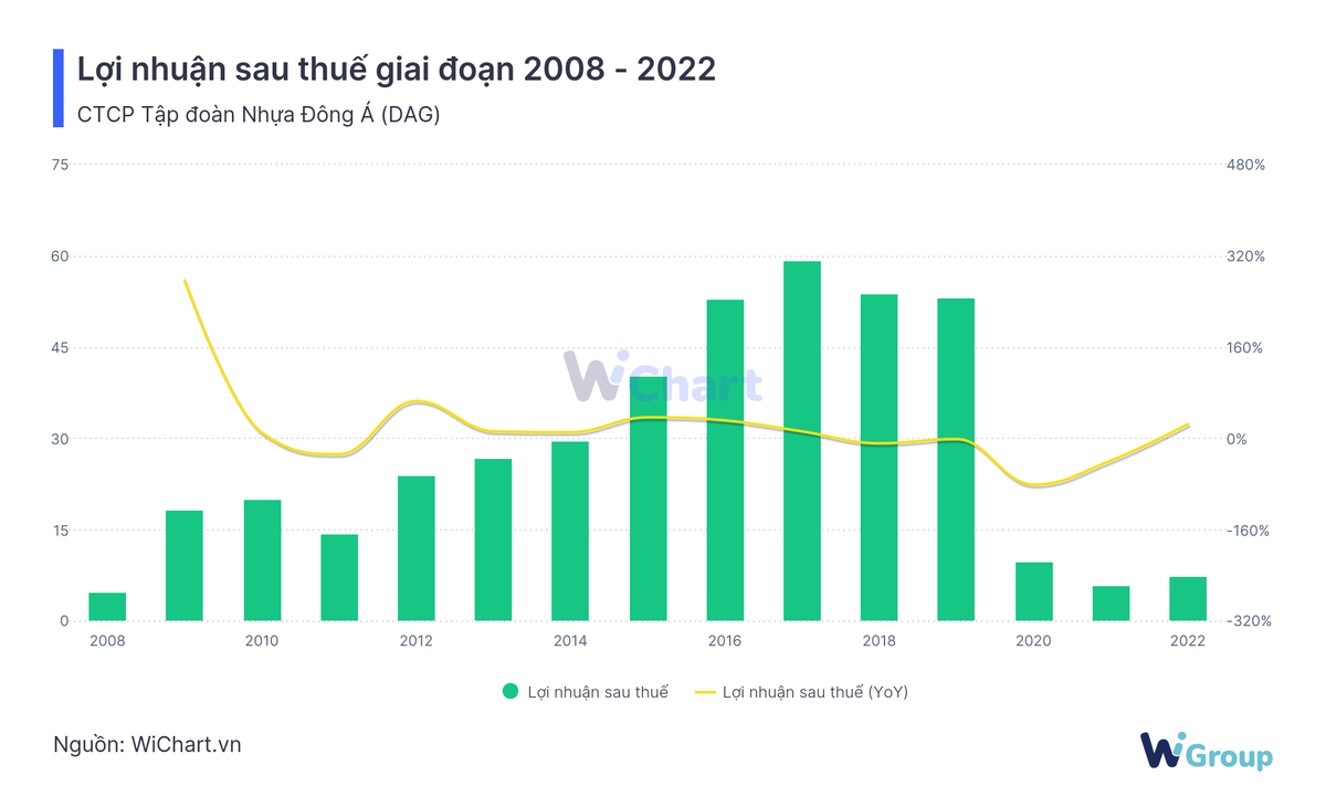 Bước ngoặt đảo chiều xuất hiện từ năm 2020, doanh thu của DAG có sự trồi sụt, biên lợi nhuận gộp doanh nghiệp bắt đầu thu hẹp, dẫn đến lãi ròng từ 53 tỷ đồng năm 2019 giảm mạnh chỉ còn 9,8 tỷ đồng năm 2020, giảm tiếp xuống 5,9 tỷ đồng năm 2021 và nhích lên gần 7,4 tỷ đồng năm 2022.