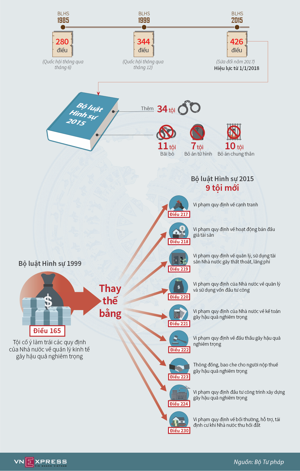 Từ ngày 1/1/2018, Bộ luật Hình sự 2015 chính thức có hiệu lực, theo đó 11 tội danh tại Bộ luật Hình sự 1999 không còn gồm Kinh doanh trái phép; Cố ý làm trái quy định của Nhà nước về quản lý kinh tế gây hậu quả nghiêm trọng; Báo cáo sai trong quản lý kinh tế; Tảo hôn; Đăng ký kết hôn trái pháp luật. Trong đó, tội Cố ý làm trái quy định Nhà nước gây hậu quả nghiêm trọng được thay thế bằng 9 tội danh mới.