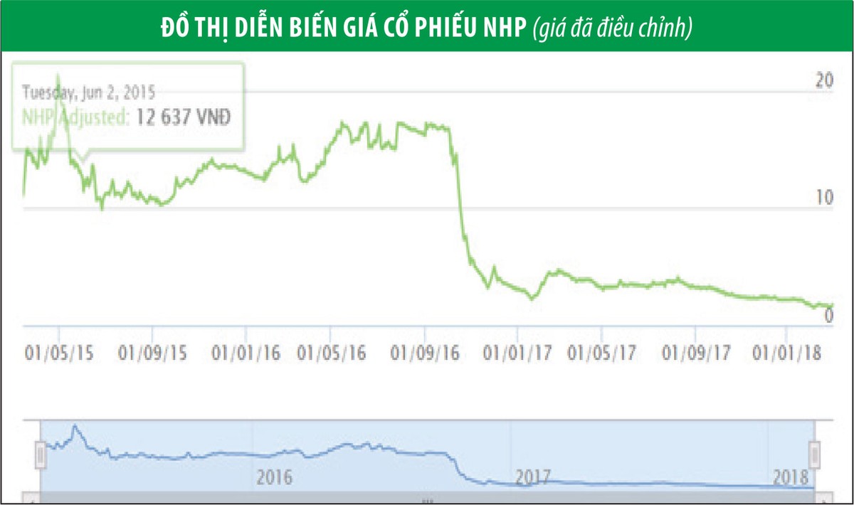 Kết thúc phiên giao dịch chào sàn, cổ phiếu NHP có giá 15.600 đồng/cổ phiếu, tăng 30% so với giá tham chiếu. Mức giá này, nếu điều chỉnh các yếu tố hưởng quyền (bao gồm phát hành thông qua chào bán, chia cổ tức, trả cổ tức bằng tiền…) tương đương mức 11.250 đồng/cổ phiếu ở thời điểm hiện tại. Nhưng thực tế, giá giao dịch cuối ngày 14/3/2018 của NHP là 1.900 đồng/cổ phiếu. Điều này đồng nghĩa với việc, nhà đầu tư mua NHP ở thời điểm chào sàn đã phải chịu mức lỗ hơn 83%.