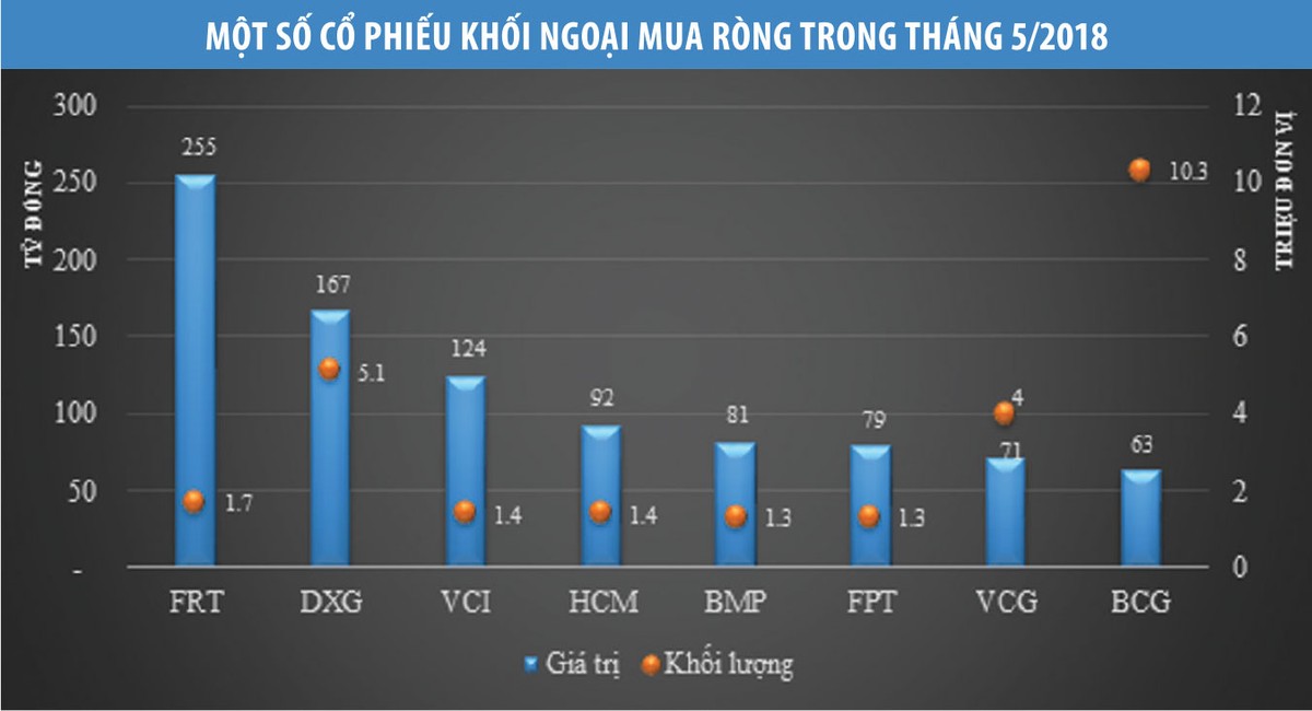 Mới niêm yết từ 26/4/2018, FRT của CTCP Bán lẻ kỹ thuật số FPT là một trong những cổ phiếu được khối ngoại mua ròng nhiều nhất trong tháng 5 với 255 tỷ đồng, tương đương 1,7 triệu đơn vị. Giá trị mua ròng tại FRT trên sàn niêm yết chỉ xếp sau VHM và VIS.