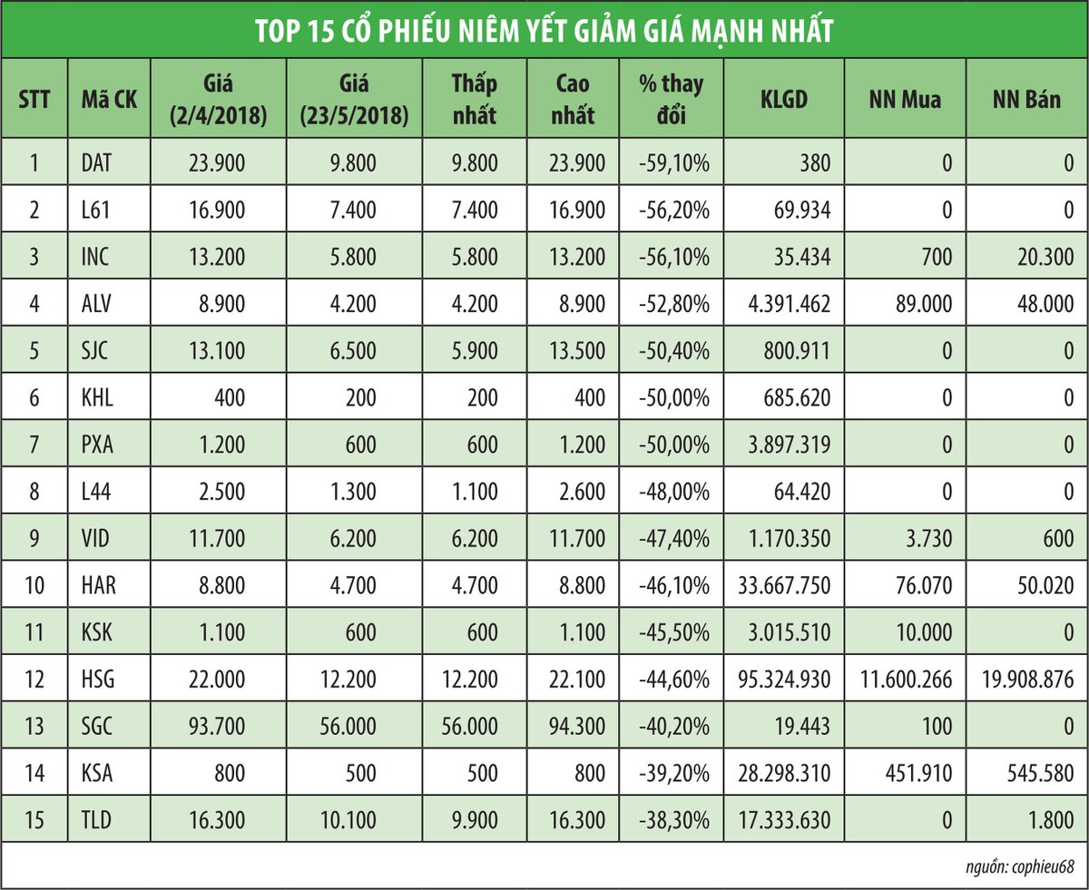Sau DAT, L61 và INC là 2 mã có mức giảm trên 56% trong cùng khoảng thời gian trên, nhưng cả 2 mã này đều có thanh khoản tương đối thấp. Riêng cổ phiếu ALV của Công ty cổ phần Đầu tư phát triển Hạ tầng ALV có mức giảm giá lớn thứ 4 toàn thị trường (niêm yết), nhưng là cổ phiếu có mức thanh khoản khá tốt, với khối lượng giao dịch lên tới gần 4,4 triệu cổ phiếu trong gần 2 tháng trên vốn điều lệ gần 56,6 tỷ đồng.