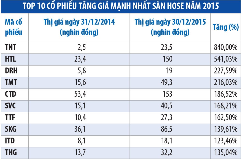 Đại diện cho nhóm cổ phiếu tăng giá mạnh nhất trên sàn HNX năm 2015 là cổ phiếu của nhóm ngành vật liệu xây dựng, VCS của CTCP Vicostone, với mức tăng gấp ba lần, từ 24.600 đồng/CP lên 73.400 đồng/CP.